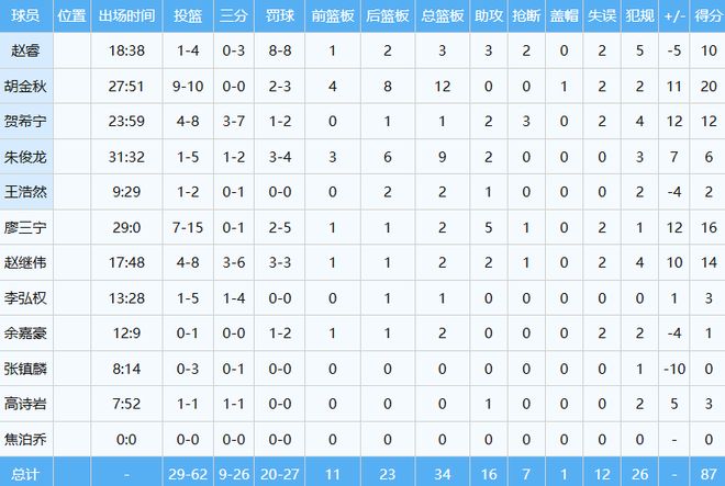 全场比赛,胡金秋首发出战约28分钟,投篮10中9,以几乎100%命中率砍下20分12板(4前场板),完爆日本男篮的归化内线科克,带领中国男篮87-80赢下了至关重要的比赛。